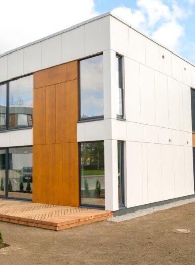 - Bauweise: Vorgefertigte Holzelemente, vor Ort mit Fassadenplatten fertiggestellt