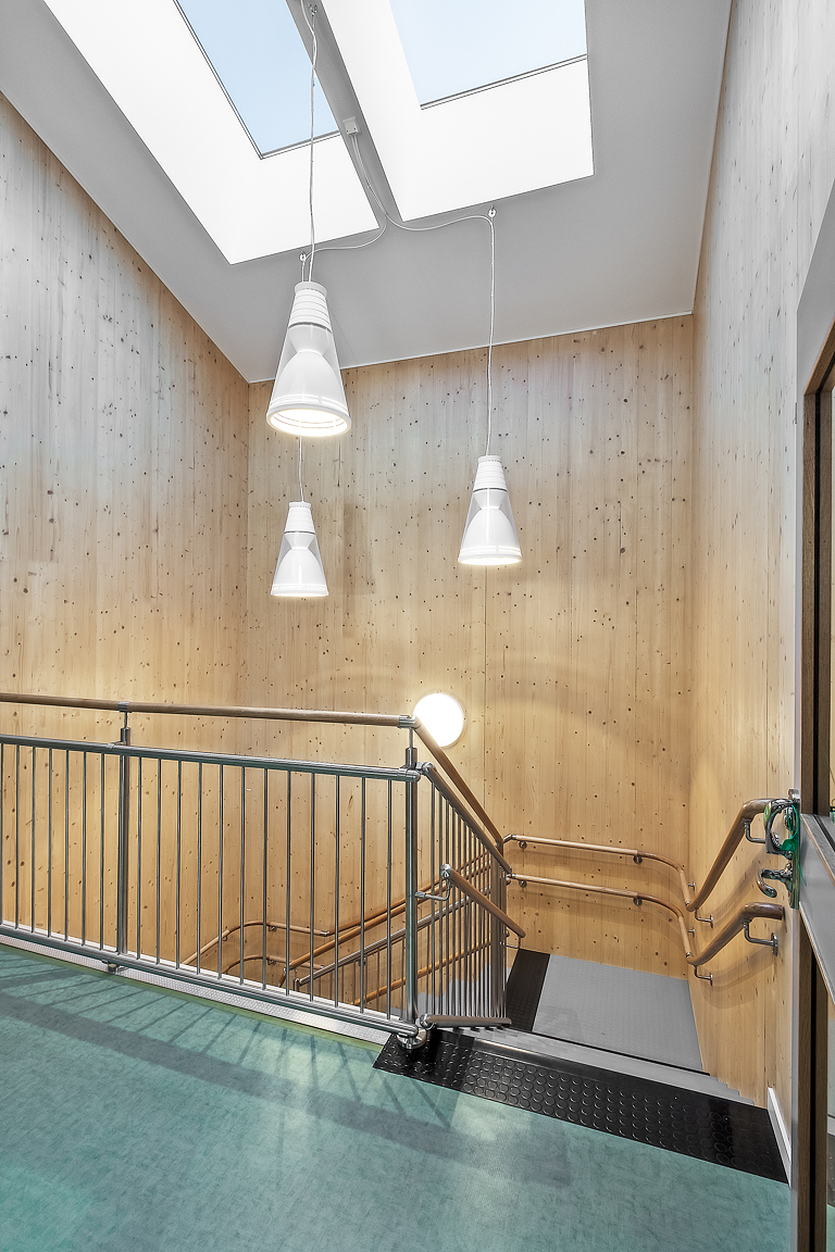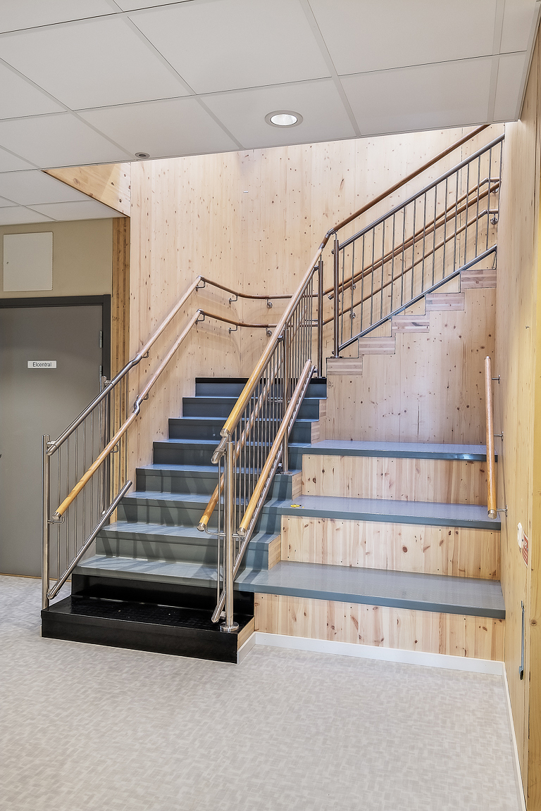 Ceiling elements: the ceilings of the building and most of the internal walls were made of CLT. A special, up to 25 mm thick, sound insulation material was used between the CLT ceiling elements and load-bearing internal wall elements.