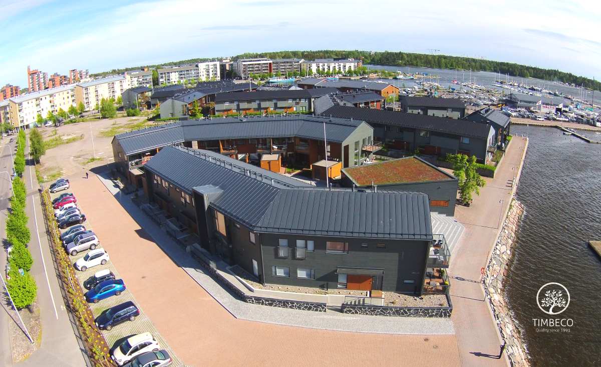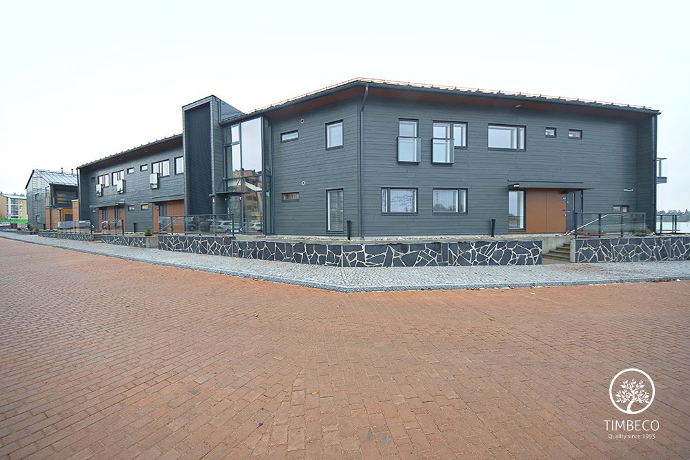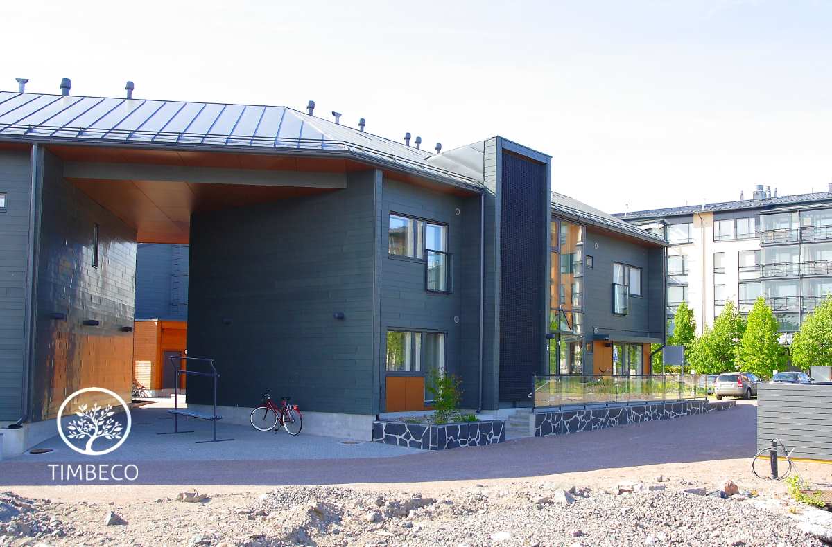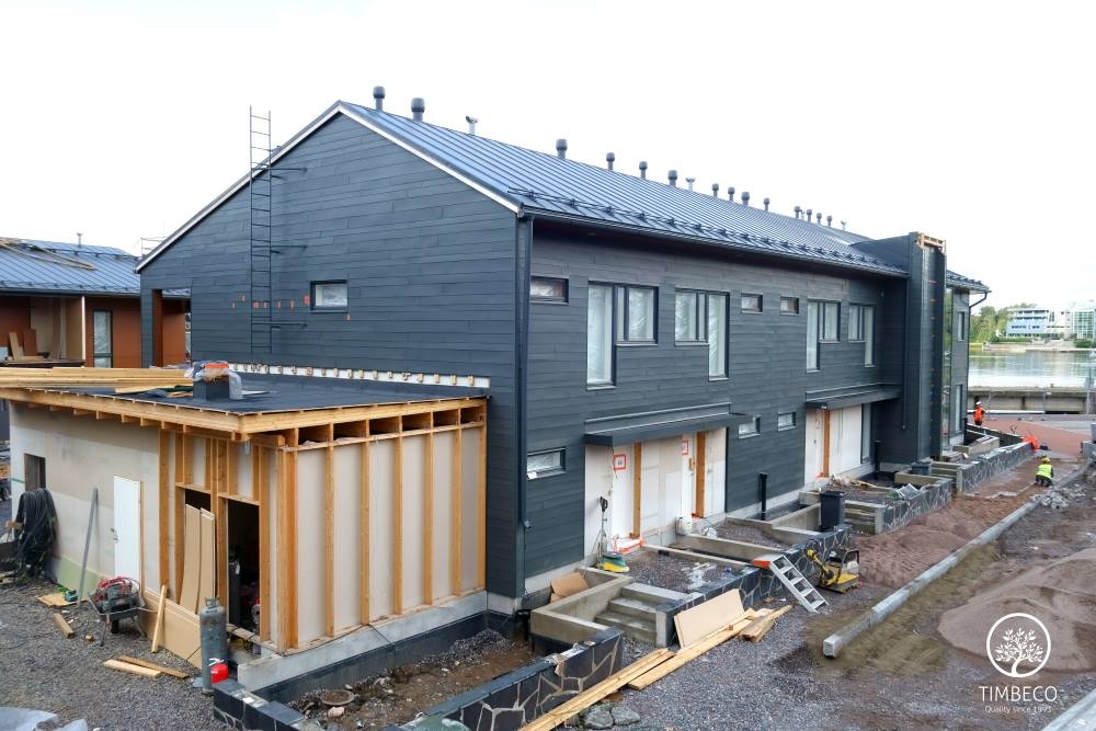 Timbeco manufactured and installed prefab timber frame wall elements (with nearly the maximum state of readiness) for concrete terraced houses in Finland. The prefab wall elements were manufactured and installed on two-storey concrete terraced houses in the highly valued Merihelmi new development in Helsinki. Windows and electricity equipment were installed on the elements in the manufacturing plant. The sheet metal boards used for external finishing were installed on site. The whole Merihelmi project will be completed by autumn 2014.