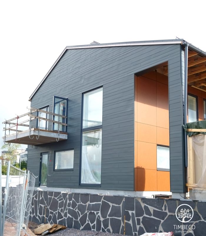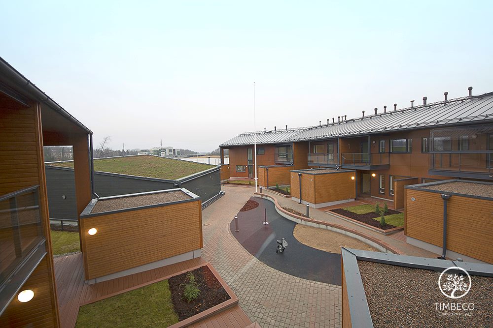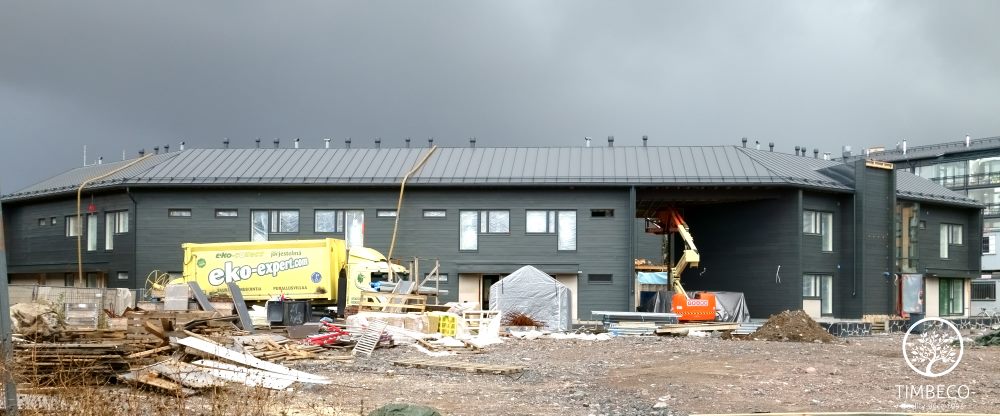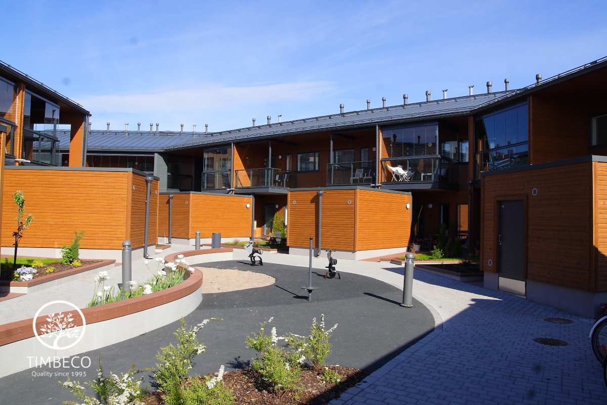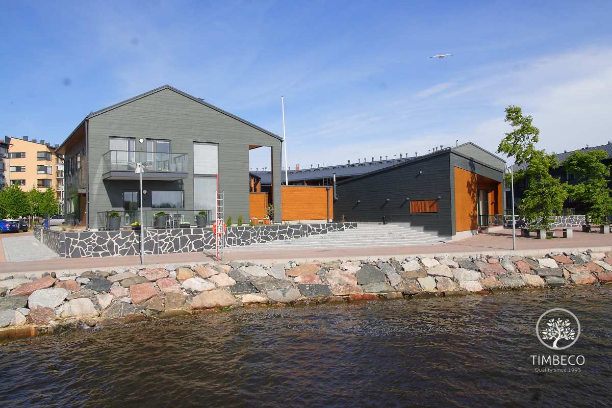 Timbeco manufactured and installed prefab timber frame wall elements (with nearly the maximum state of readiness) for concrete terraced houses in Finland. The prefab wall elements were manufactured and installed on two-storey concrete terraced houses in the highly valued Merihelmi new development in Helsinki. Windows and electricity equipment were installed on the elements in the manufacturing plant. The sheet metal boards used for external finishing were installed on site. The whole Merihelmi project will be completed by autumn 2014.