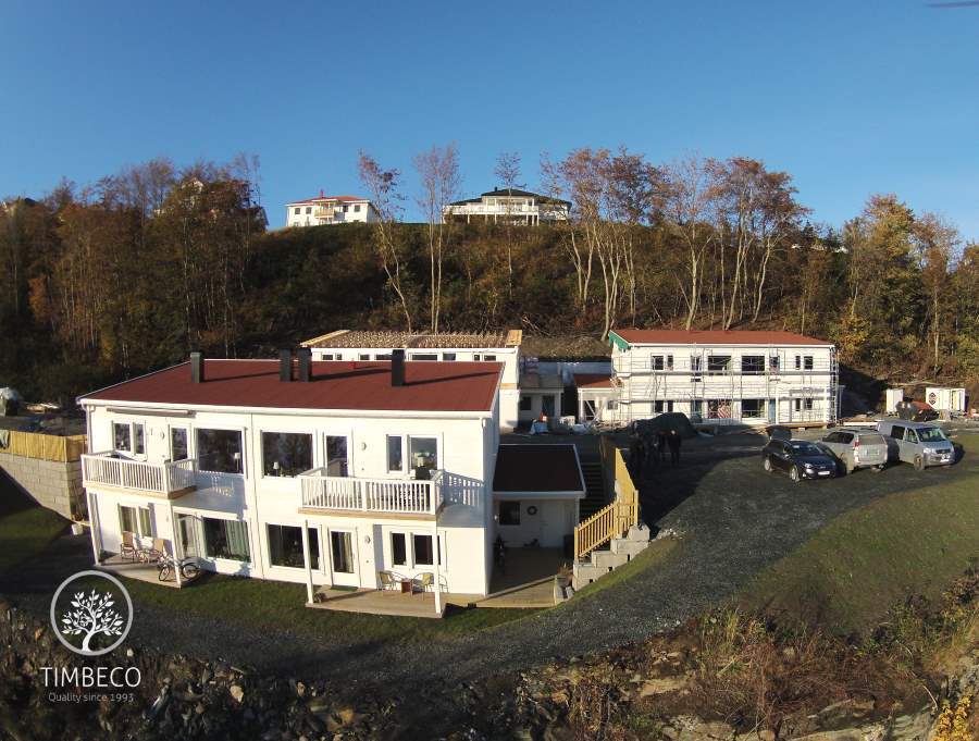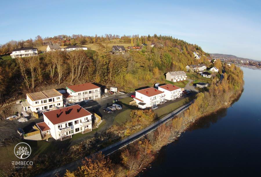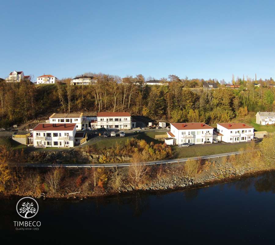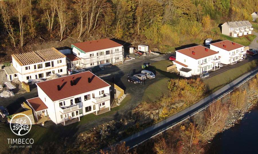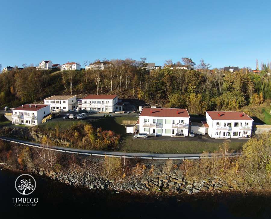 Project description: Timbeco manufactured and erected 5 apartment buildings made of prefab timber elements in Norway. At the Timbeco factory, cladding and windows with sealing and finishing were installed on prefab timber frame wall elements. In order to increase sound-proofness, inserted ceiling elements were equipped with metal acoustic balks. Also, soundproofing strips were installed between prefab wall elements and inserted ceiling elements. In order to increase fireproofness, inserted ceiling elements were equipped with a metal mesh which, in case of a fire, keeps the mineral wool around the wooden structure and prevents the wood from catching fire.