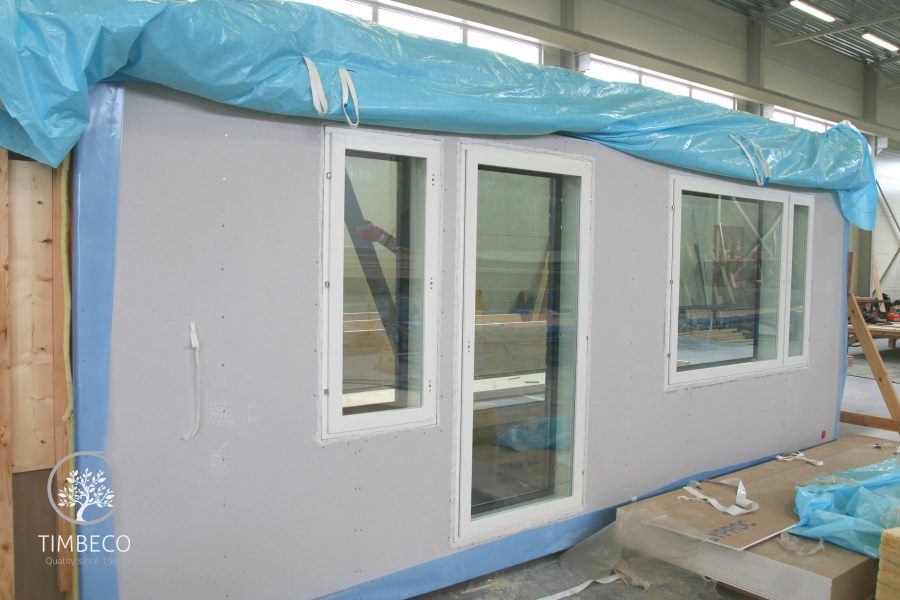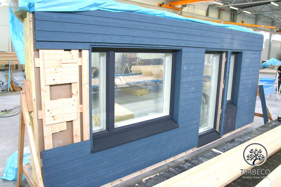 Prefab timber frame elements for external finishing, plasterboard for internal finishing, and moisture-resistant boards in wet rooms were installed at the factory. Fully finished windows were also installed at the factory.