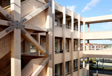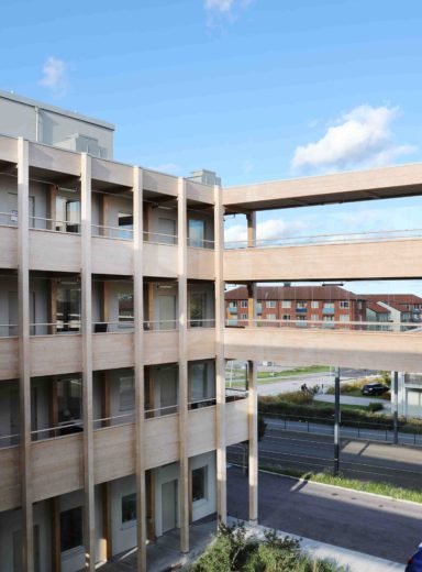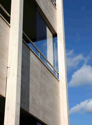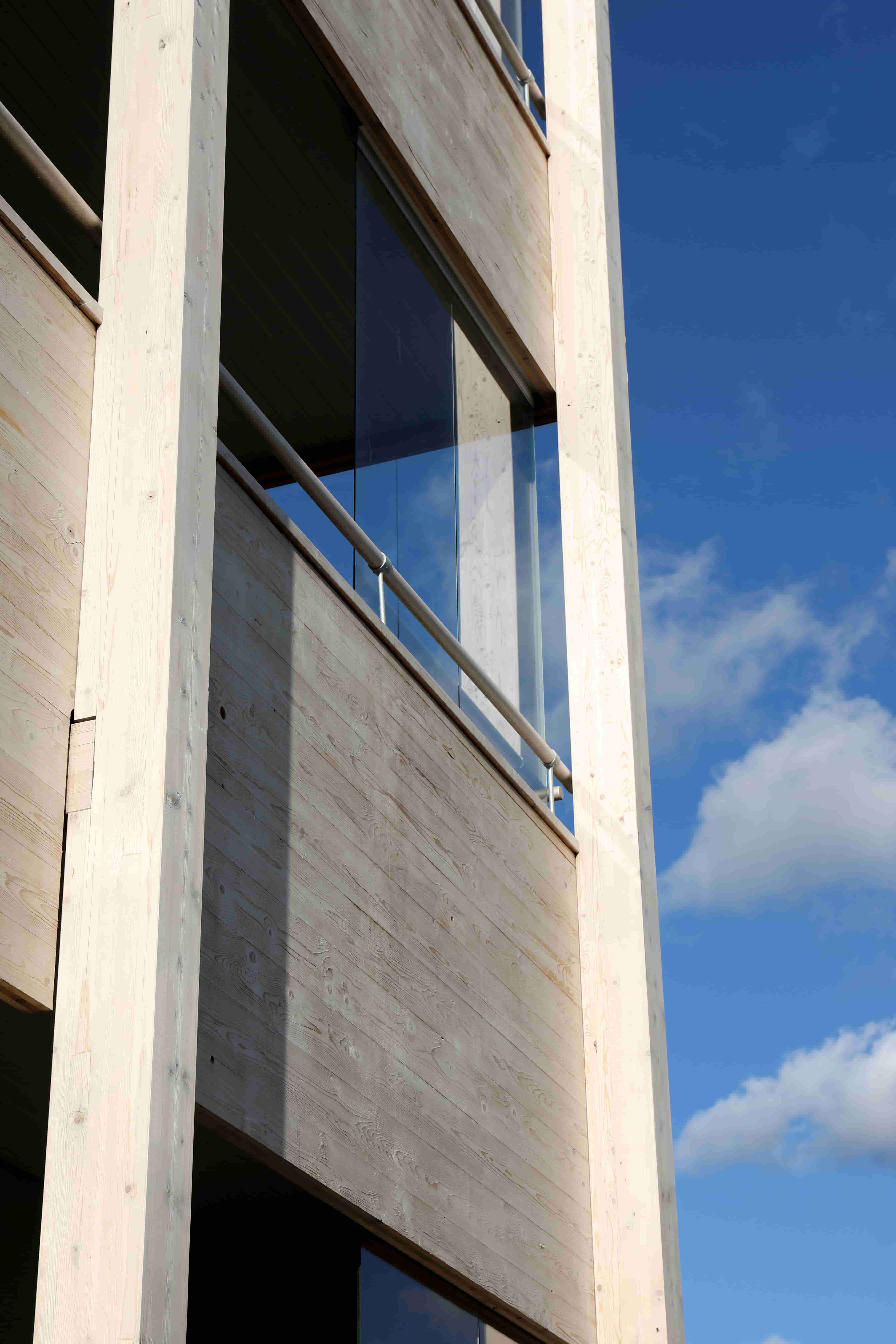 The buildings are connected by bridges made of laminated wood and CLT. The apartments have spacious balconies that are partially glazed. The ceiling of the first-floor two-level loft-type apartments is 4.1m high.