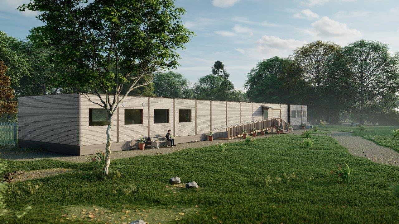 Timbeco-anlegget har en modulløs løsning for skolen som et vedlegg til sluttfasen. For tiden pågår arbeid med å installere ventilasjonsutstyr og kjøkkenapparater. Det nye skolebygget vil ha 2 klasserom i full størrelse og 2 separate rom som er egnet for gruppearbeid. Det er flere hjelpe- og toalettrom i bygningen. Det er en matlagingskurs i bygningens venstre fløy. Klienten er det norske selskapet Reblock og bygningen vil bli reist i Asker, Norge