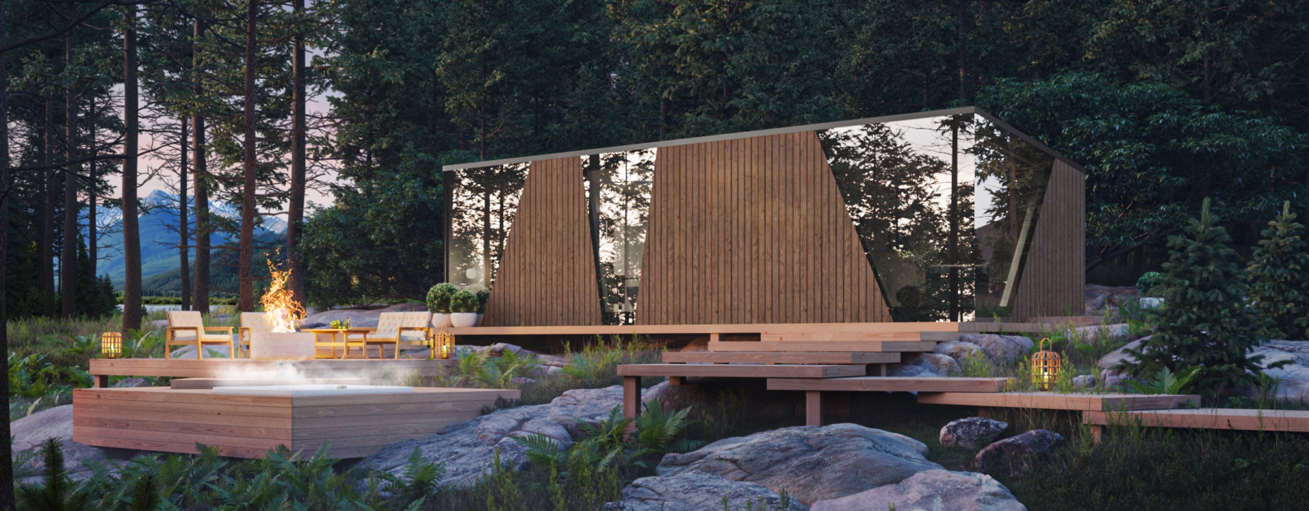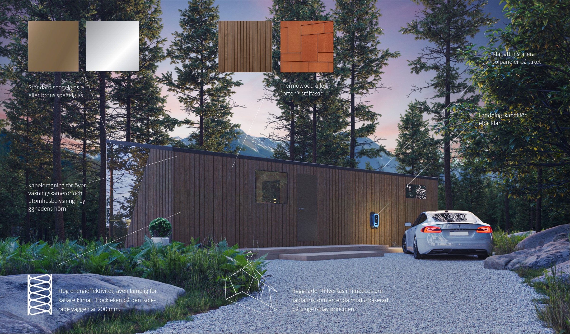 Timbeco X kombinerer moderne design med organiske elementer, som speiler skogens naturlige skjønnhet. Gulv-til-tak-vinduer lar naturen flyte inn, og skaper en rolig oase for velvære. Trekonstruksjoner og steinfliser gir en solid base for komfort, mens minimalistiske armaturer forsterker den funksjonelle elegansen – perfekt for livets mest verdifulle øyeblikk.