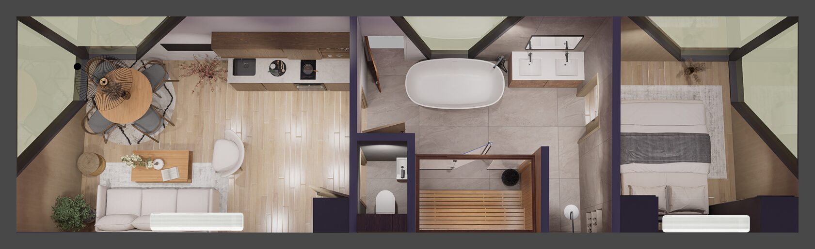 Tenk deg å tre inn i en verden der avslapning står i sentrum, og hver detalj er skapt for ditt velvære. Timbecos nyeste innovasjon gjenskaper følelsen av tilflukt og omdefinerer luksus med en integrert badstue og eksklusiv spa-opplevelse. Her forenes raffinert design med naturens harmoni, og skaper en perfekt balanse mellom komfort og uberørt skjønnhet.