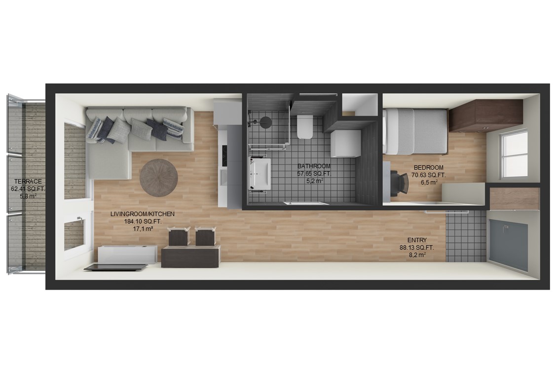 2-rumslägenheter: 8 lägenheter Flex-5 (33,5m2) och Flex-7 (33,5m2)