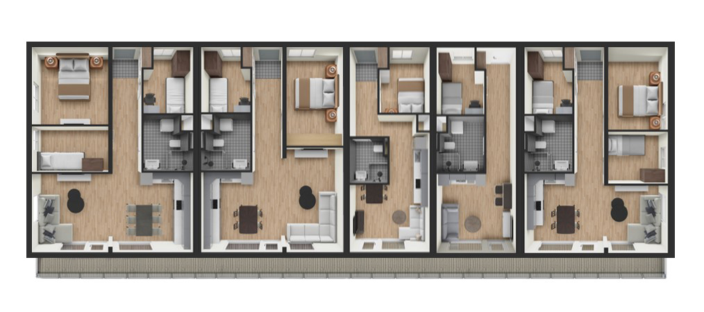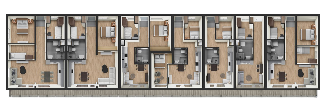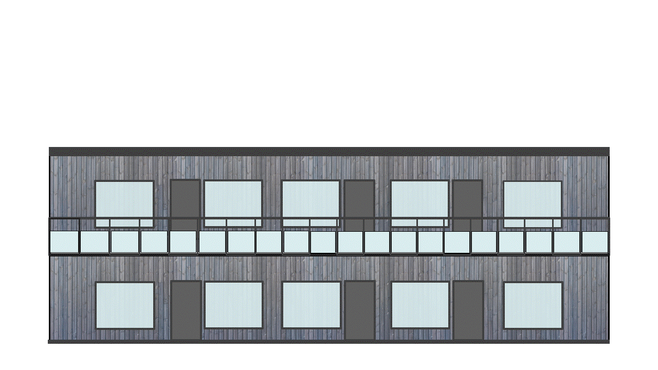 När du bygger ett Timbeco FLEX-hyreshus kan du välja mellan sju fördesignade modullösningar. Lägenheternas storlek varierar mellan 33,5 och 67,3 m², och varje bostad har antingen en egen terrass eller balkong. Tillgång till den andra våningen sker via ett externt trappsystem, som kan anpassas efter projektets specifika behov. Detta säkerställer en flexibel och skräddarsydd lösning för varje unikt byggprojekt.5 Hyreshus med 4 lägenheterHyreshus med 14 lägenheterHyreshus med 10 lägenheterHyreshus med 12 lägenheterHyreshus med 12 lägenheterFLEX BYGGPLANERFLEX RUM PLANERFLEX BYGGPLANERFLEX RUM PLANERHyreshus med 10 lägenheterDenna byggnad med 10 lägenheter erbjuder en mängd olika layouter för att tillgodose behoven hos olika boende. Byggnaden har tre distinkta lägenhetsstorlekar, vilket säkerställer flexibilitet för en rad livsstilar. Båda våningarna är utformade med samma layout för konsekvens i hela byggnaden.