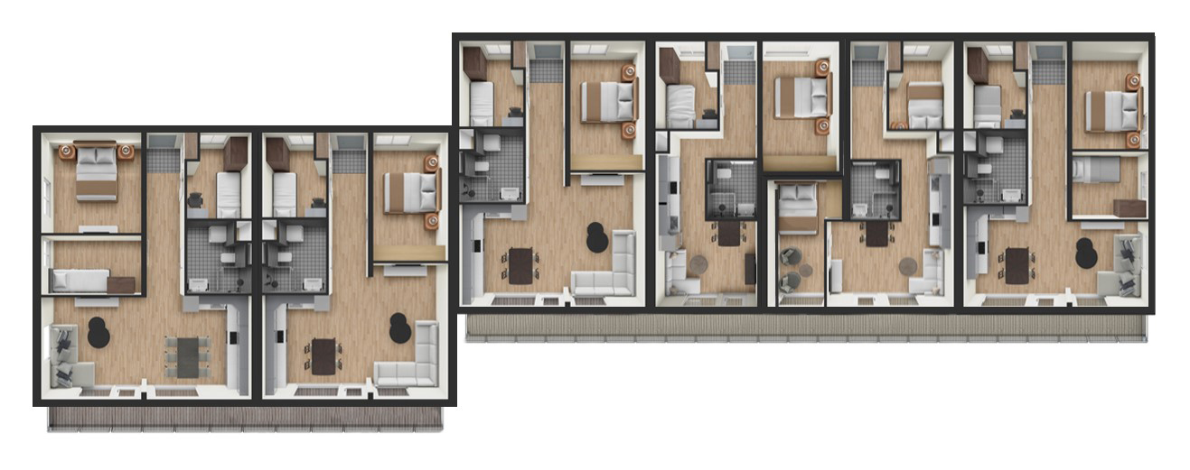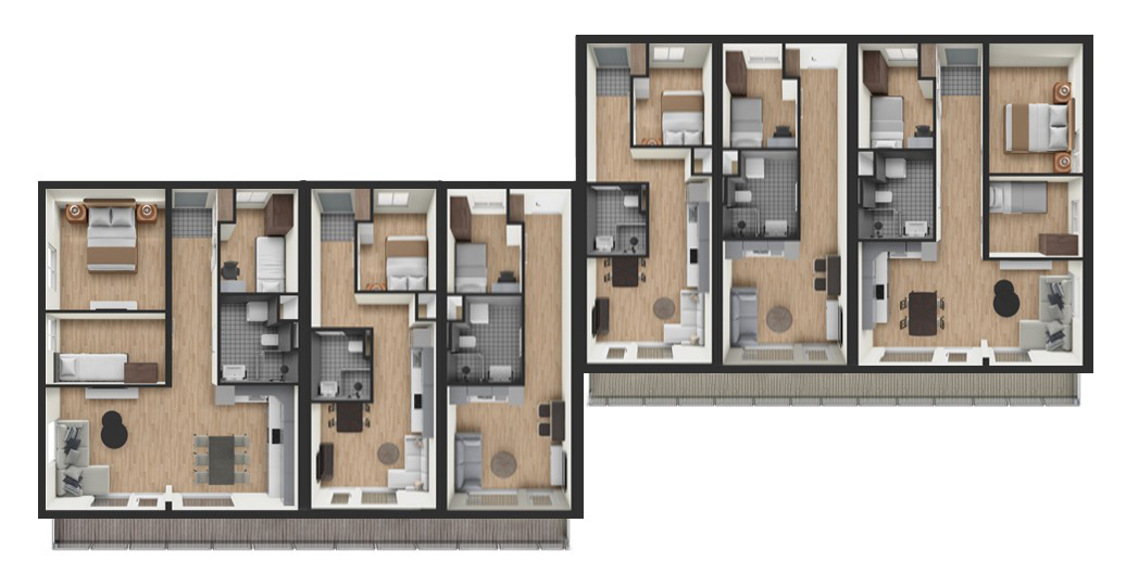 4-rumslägenheter: 4 lägenheter Flex-1 (67,2m2) och Flex-6 (59,7m2)FLEX RUM PLANERFLEX BYGGPLANERHyreshus med 12 lägenheterDenna byggnad med 12 lägenheter har en mängd olika layouter för att passa olika behov. Den innehåller en blandning av rymliga 3-rums- och 4-rumslägenheter, designade för att tillgodose en rad invånare. Byggnaderna är placerade sida vid sida, med en liten förskjutning för att skapa ett dynamiskt och visuellt tilltalande arrangemang. Båda våningarna erbjuder identiska lägenhetslayouter, vilket säkerställer enhetlighet i hela byggnaden.