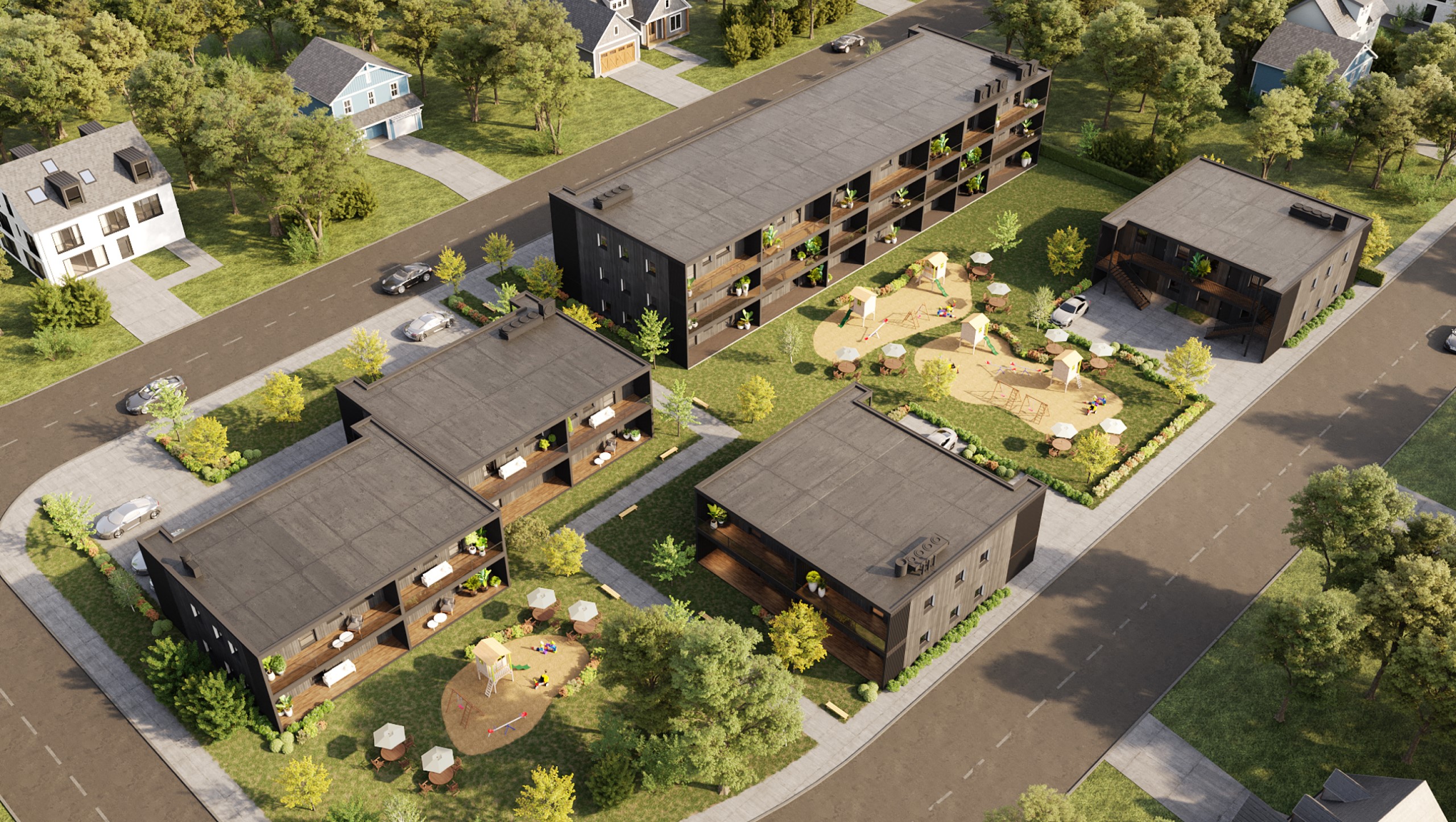 Timbeco Flex använder prefabricerade trästommesmoduler för att skapa multifunktionella bostäder med en smart plug-and-play-lösning. Våra byggnader erbjuder en modern och hälsosam livsmiljö, förbättrar inomhusklimatet och har hållbarhet i fokus. Med snabb montering, minimala utsläpp på byggplatsen och enheter som är nästan 100 % återvinningsbara, är Timbeco Flex ett framtidssäkert val.